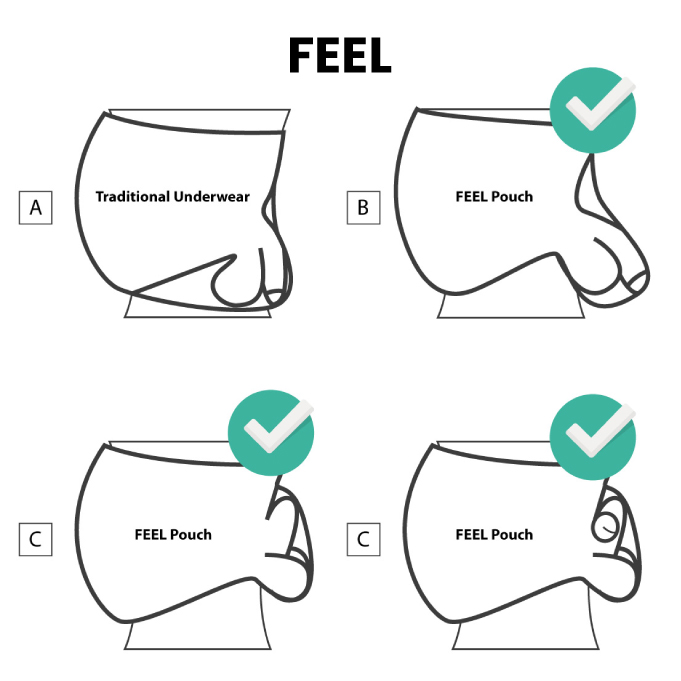 The rounded pouch that is applied on our FEEL product lines will adapt to your wearing habits, and still keep your genitals properly supported.
