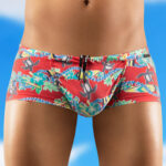 This Swim Mini Trunk with Flowers pattern boasts a concealed waistband is joined by a drawstring that you can tie if necessary. You can leave the drawstring ends visible or hidden in the pouch.