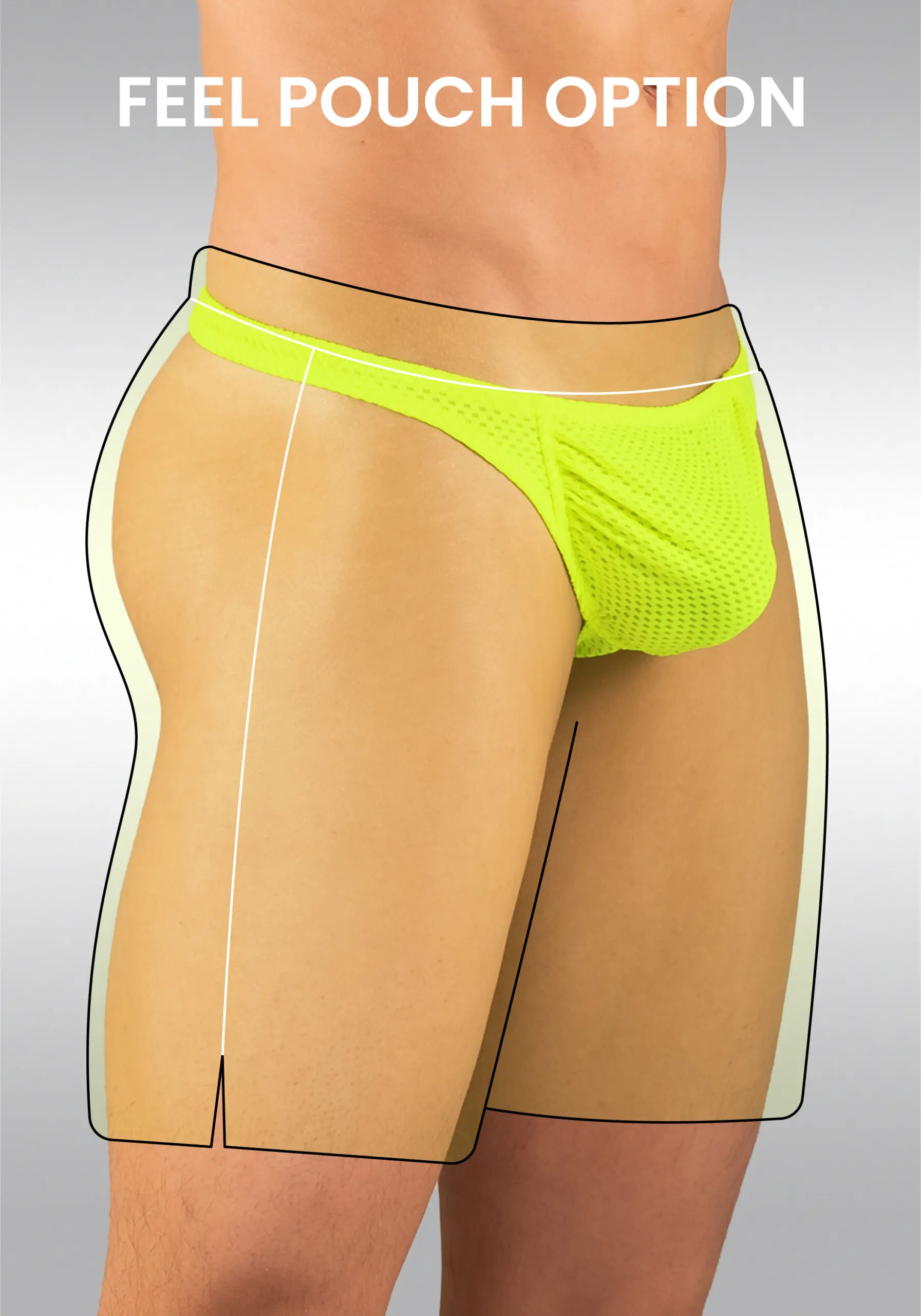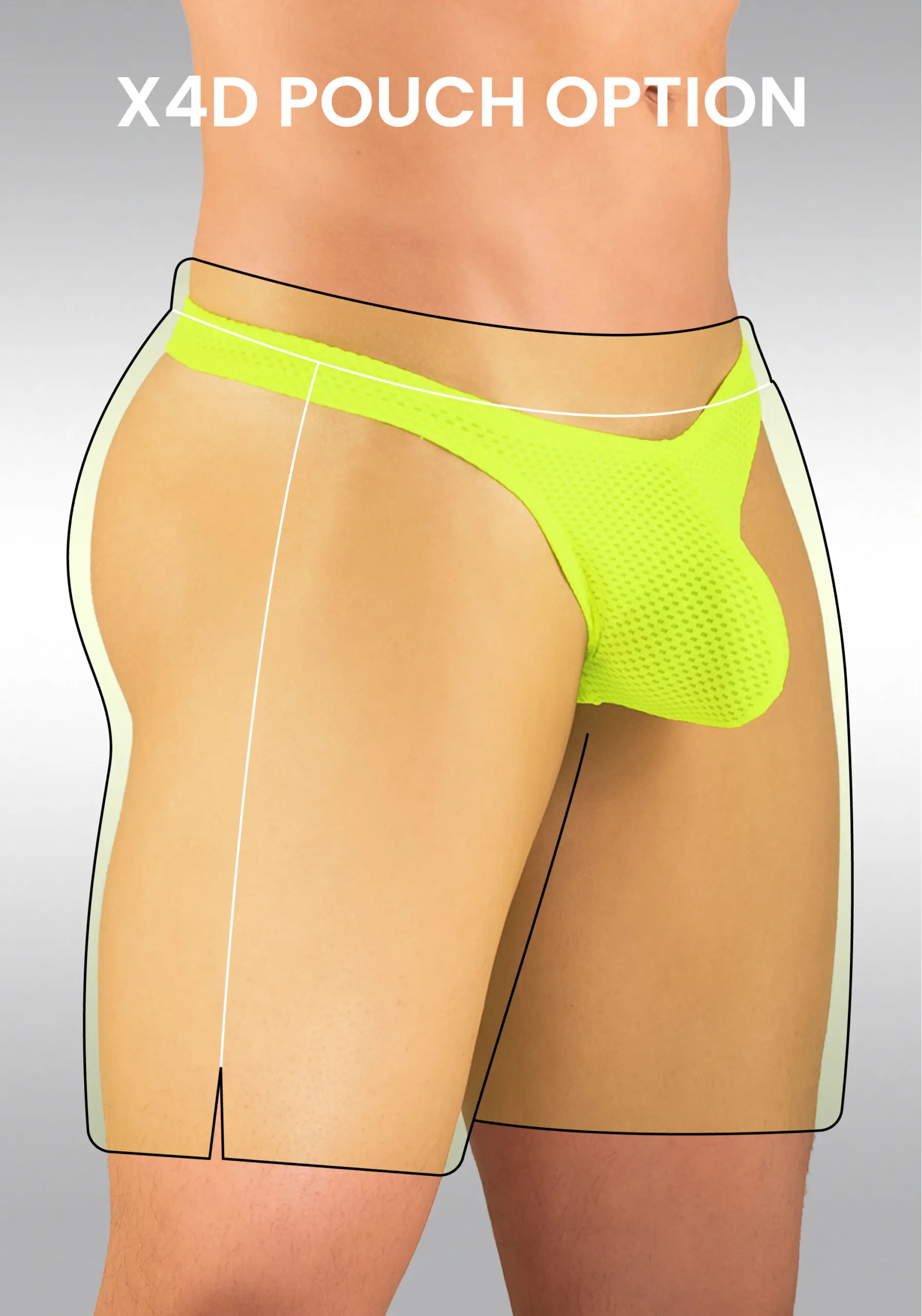 While the outside of the board short in yellow looks great, you can choose between a nose-shaped pouch in protruding X4D design or a D-shaped pouch in our adaptable FEEL design. Check a guide to pick the perfect pouch for you on our Instagram community.
