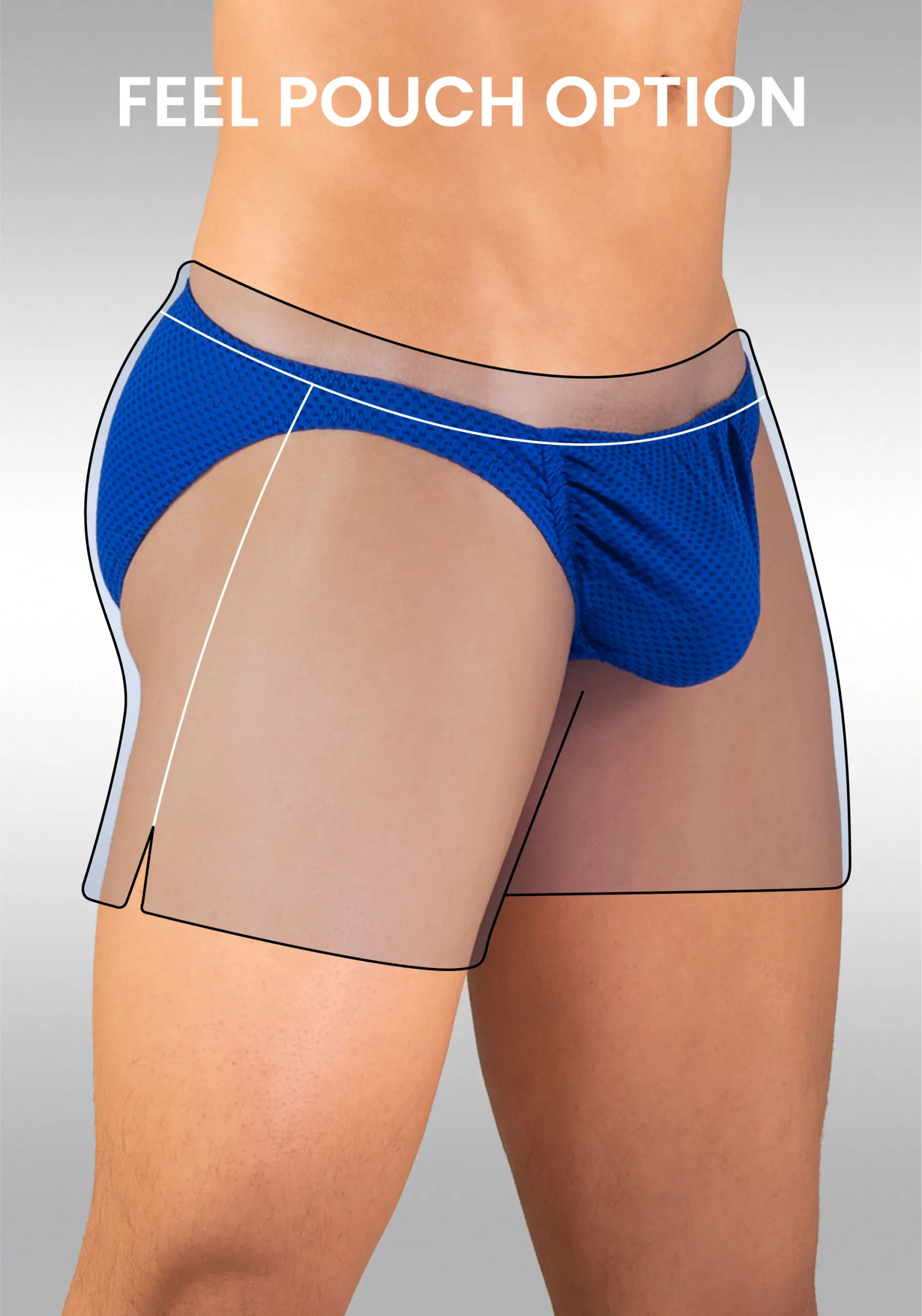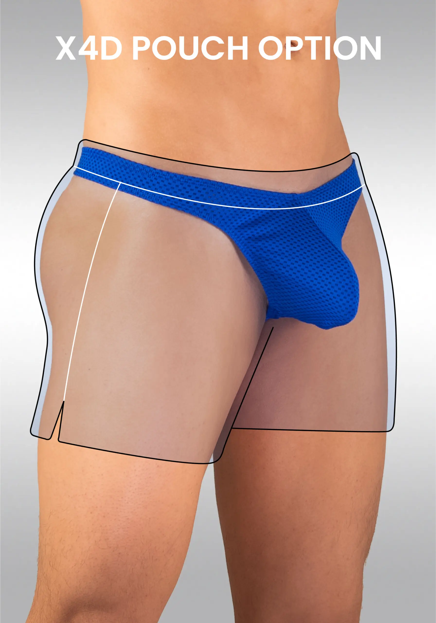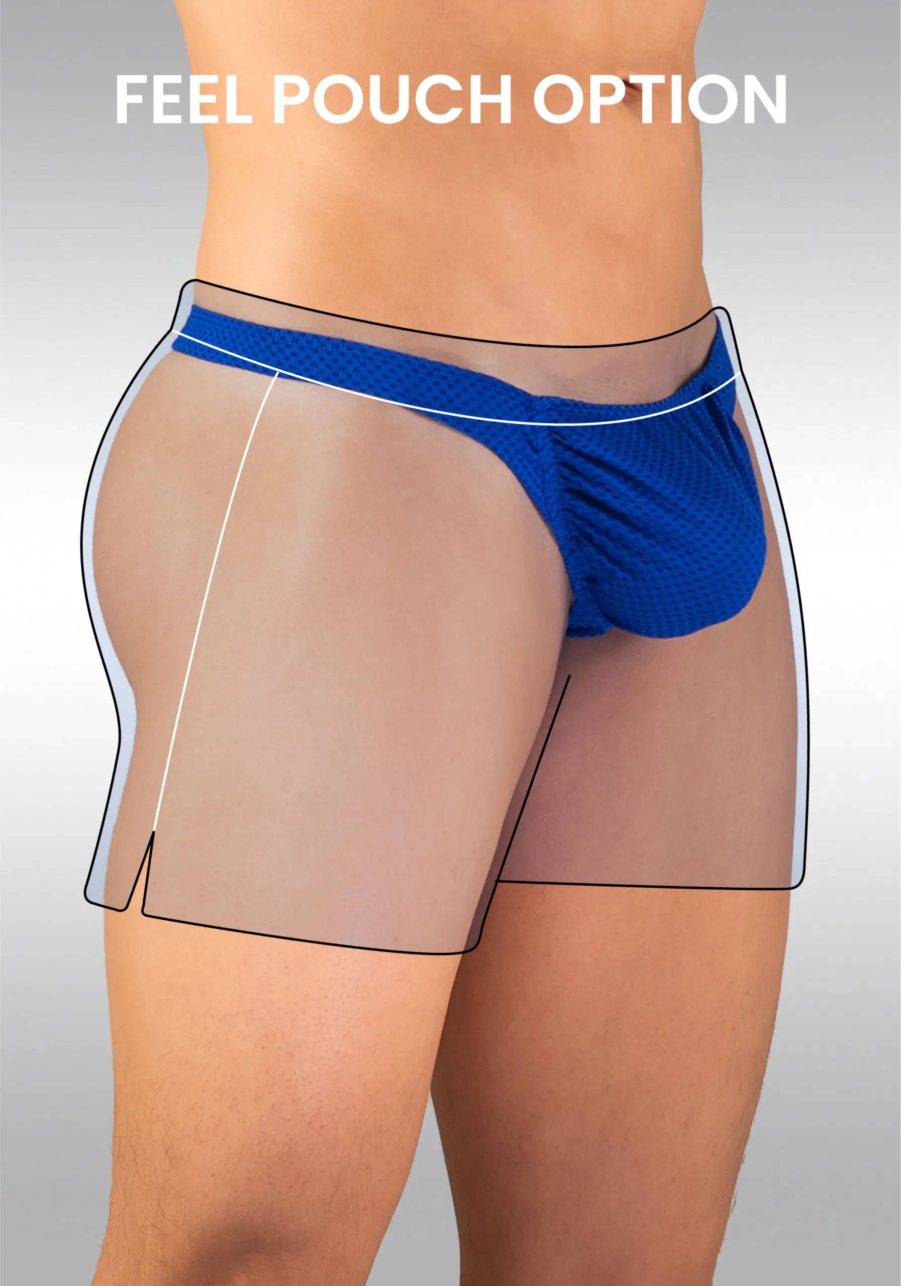 While the outside of the GYM short in blue looks great, you can choose between a nose-shaped pouch in protruding X4D design or a D-shaped pouch in our adaptable FEEL design. Check a guide to pick the perfect pouch for you on our Instagram community.