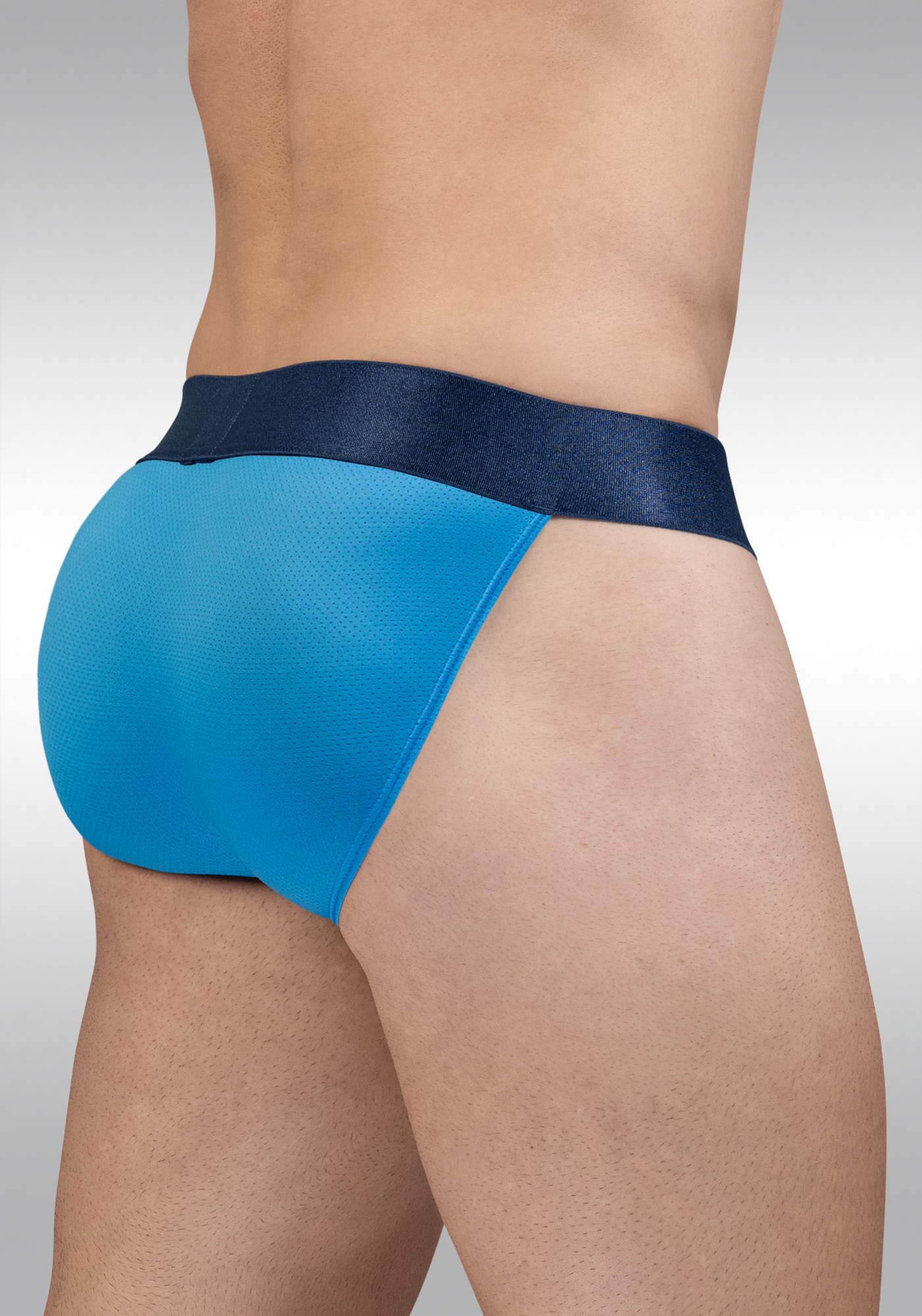 The MAX Bold SE Bikini in river blue is made from our signature polyester–elastane micro-mesh fabric, designed with ultra-fine perforations to enhance airflow and breathability. The elastane content provides flexible stretch for a comfortable, body-contouring fit, while the polyester fibers ensure excellent durability. The result is a high-performance fabric that combines three key qualities for premium underwear: enhanced breathability, adaptive stretch, and long-lasting resilience.